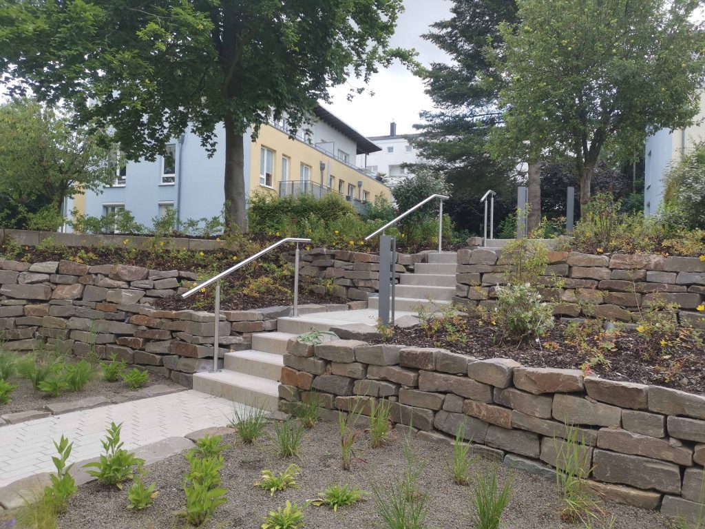 Der tief liegende Innenhof des Seniorenzentrums hatte dringend eine Überholung nötig. Der Hang mit vom Efeu überwucherten Strauchresten wurde übermächtig und gleichzeitig unansehnlich. Der Wunsch nach mehr Platz draußen und mehr Erlebnisqualität war absolut nachvollziehbar. Nach der Umgestaltung stützen Trockenmauern aus Grauwacke den Hang, begleitet von unzähligen Gräsern und Stauden, ein Gedenkbrunnen sprudelt und Bäume und strahlend rote Sonnenschirme spenden Schatten.